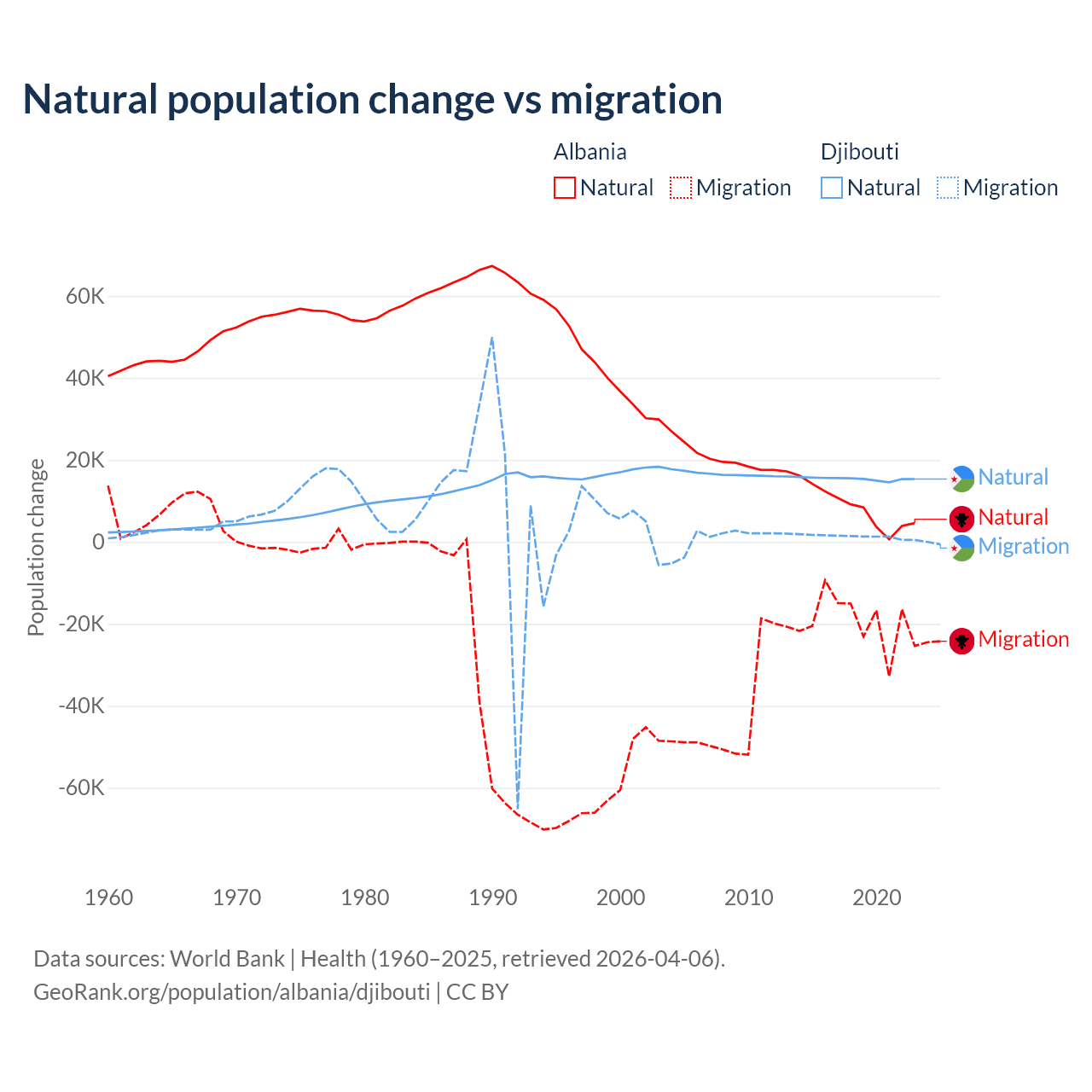 Over the last 10 years, 30% of the population change in Albania is from natural causes (a gain of 83,840 people) and 70% is from migration (a loss of 195,891 people). In Djibouti 92.1% is from natural causes (a gain of 153,892 people) and 7.87% is from migration (a gain of 13,138 people).