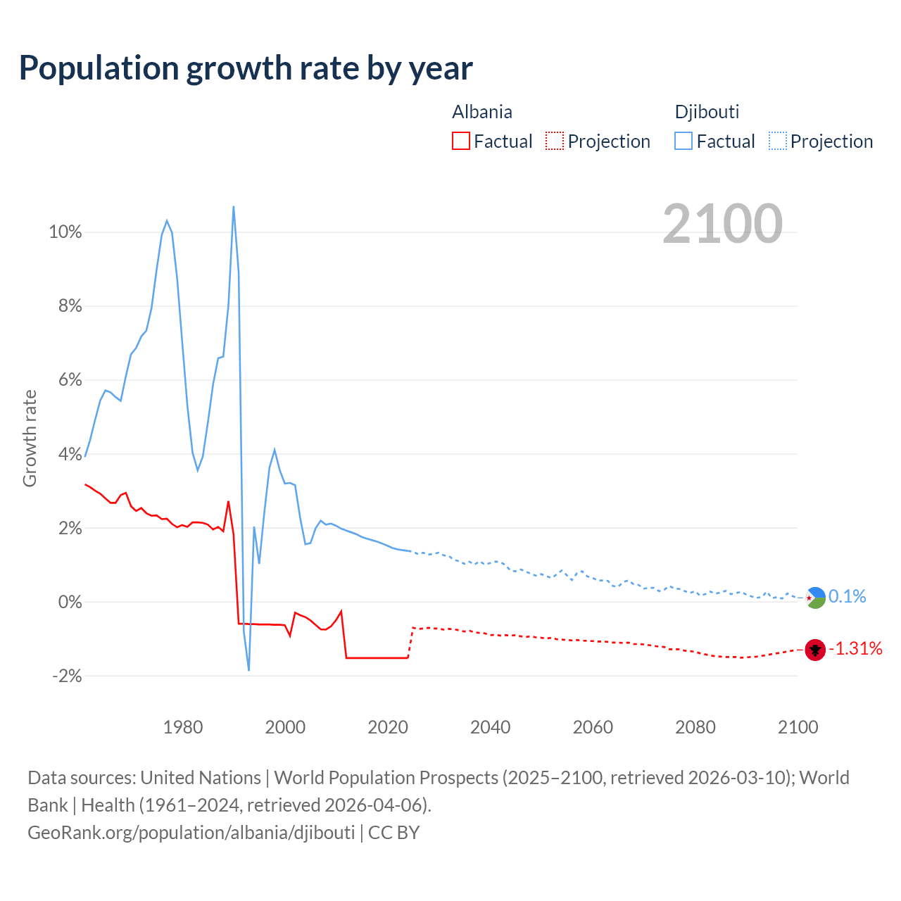 - For the last 10 years, Albania has had an average growth rate of -1.53% per year vs +1.57% in Djibouti.