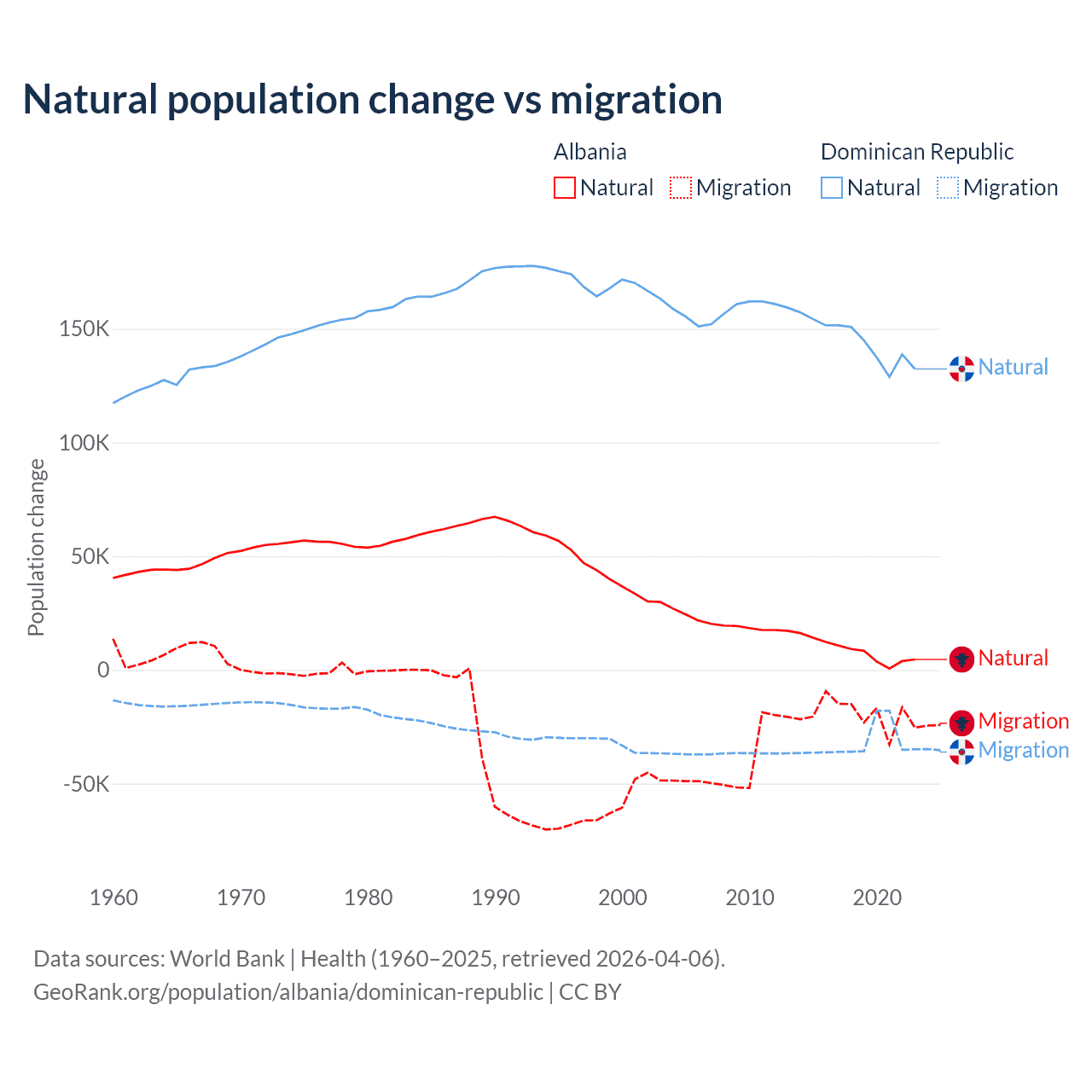 Over the last 10 years, 30% of the population change in Albania is from natural causes (a gain of 83,840 people) and 70% is from migration (a loss of 195,891 people). In the Dominican Republic 81.8% is from natural causes (a gain of 1,447,764 people) and 18.2% is from migration (a loss of 322,919 people).