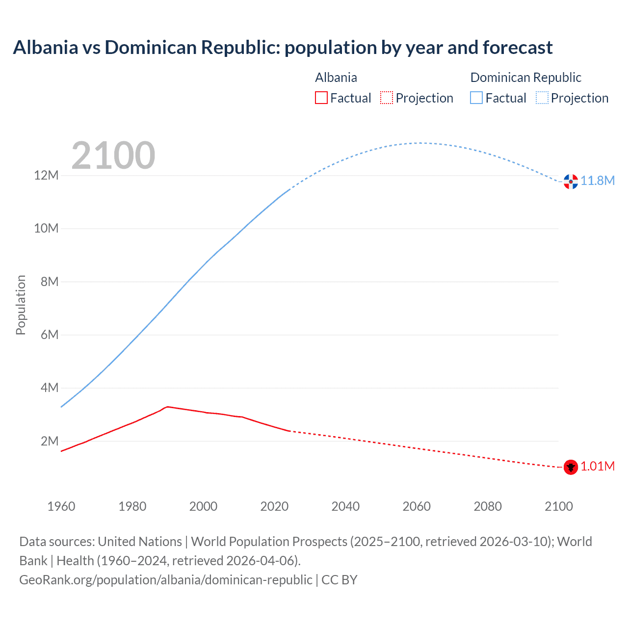 Albania vs Dominican Republic: population by year and forecast