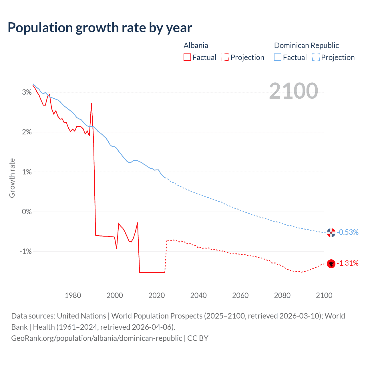 - For the last 10 years, Albania has had an average growth rate of -1.53% per year vs +1.04% in the Dominican Republic.