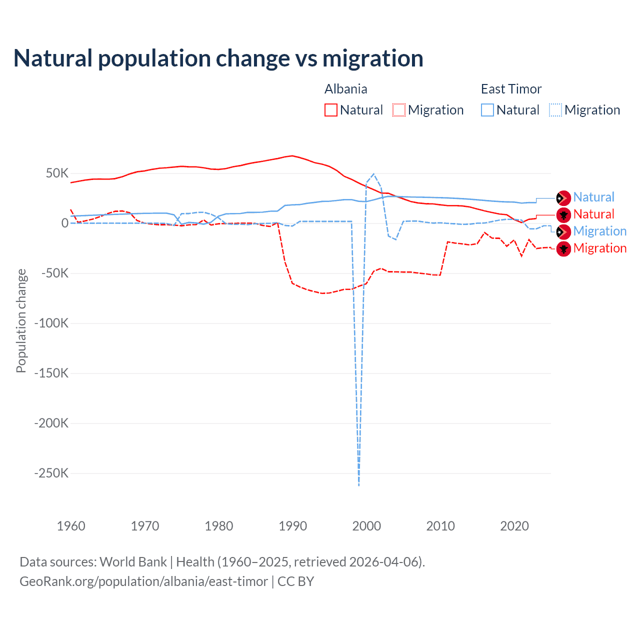 Over the last 10 years, 30% of the population change in Albania is from natural causes (a gain of 83,840 people) and 70% is from migration (a loss of 195,891 people). In East Timor 98.3% is from natural causes (a gain of 217,698 people) and 1.66% is from migration (a gain of 3,665 people).