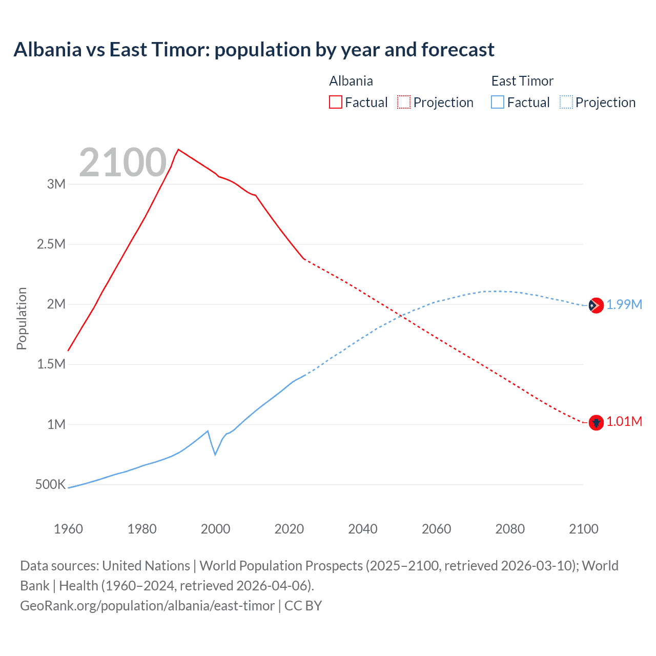 Albania vs East Timor: population by year and forecast