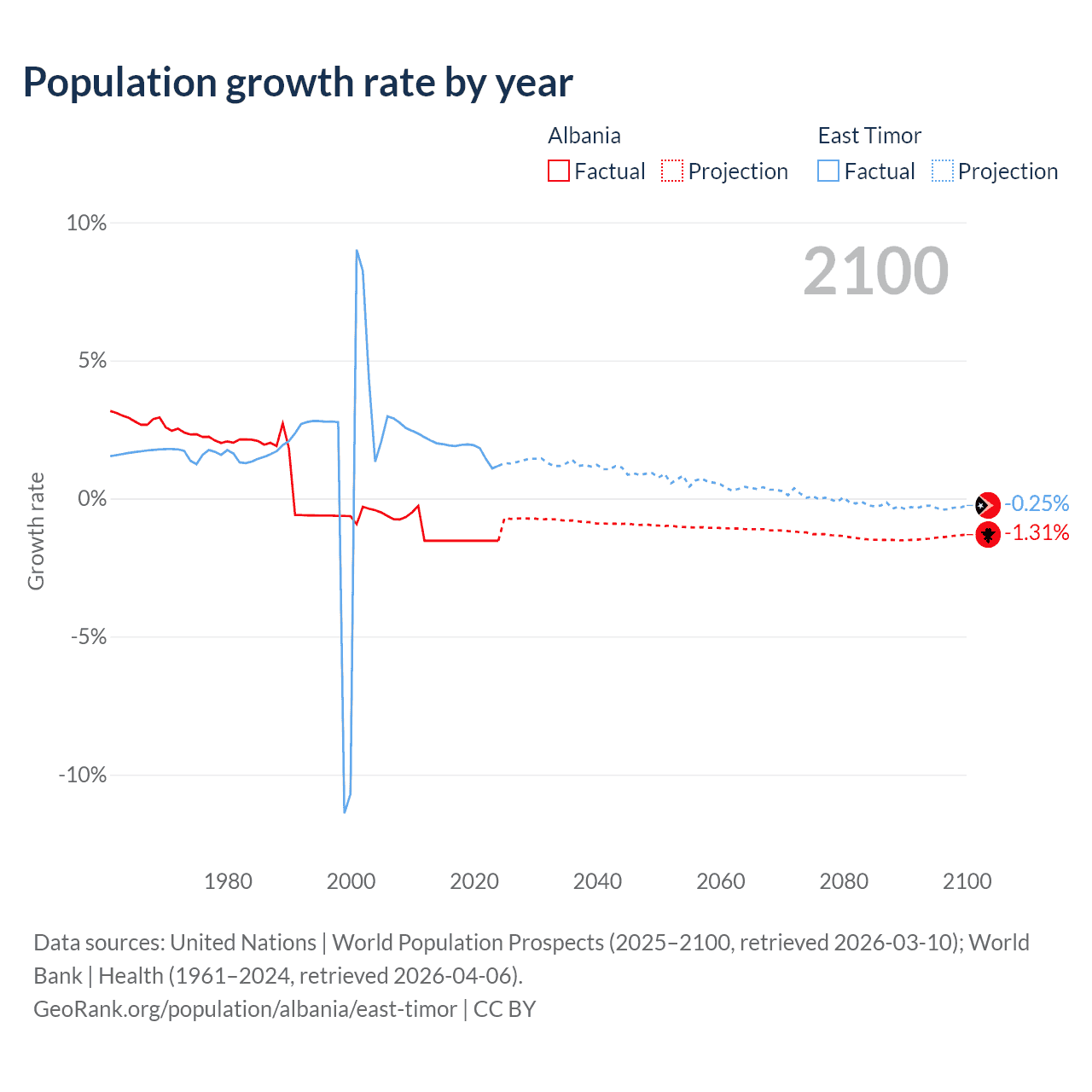 - For the last 10 years, Albania has had an average growth rate of -1.53% per year vs +1.74% in East Timor.