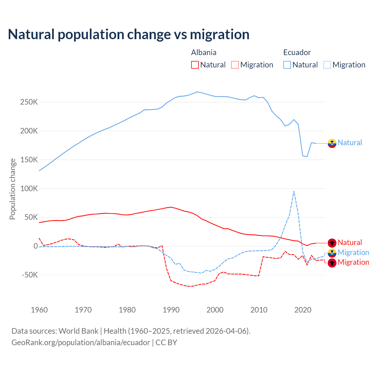Over the last 10 years, 30% of the population change in Albania is from natural causes (a gain of 83,840 people) and 70% is from migration (a loss of 195,891 people). In Ecuador 91.9% is from natural causes (a gain of 1,964,352 people) and 8.08% is from migration (a gain of 172,707 people).