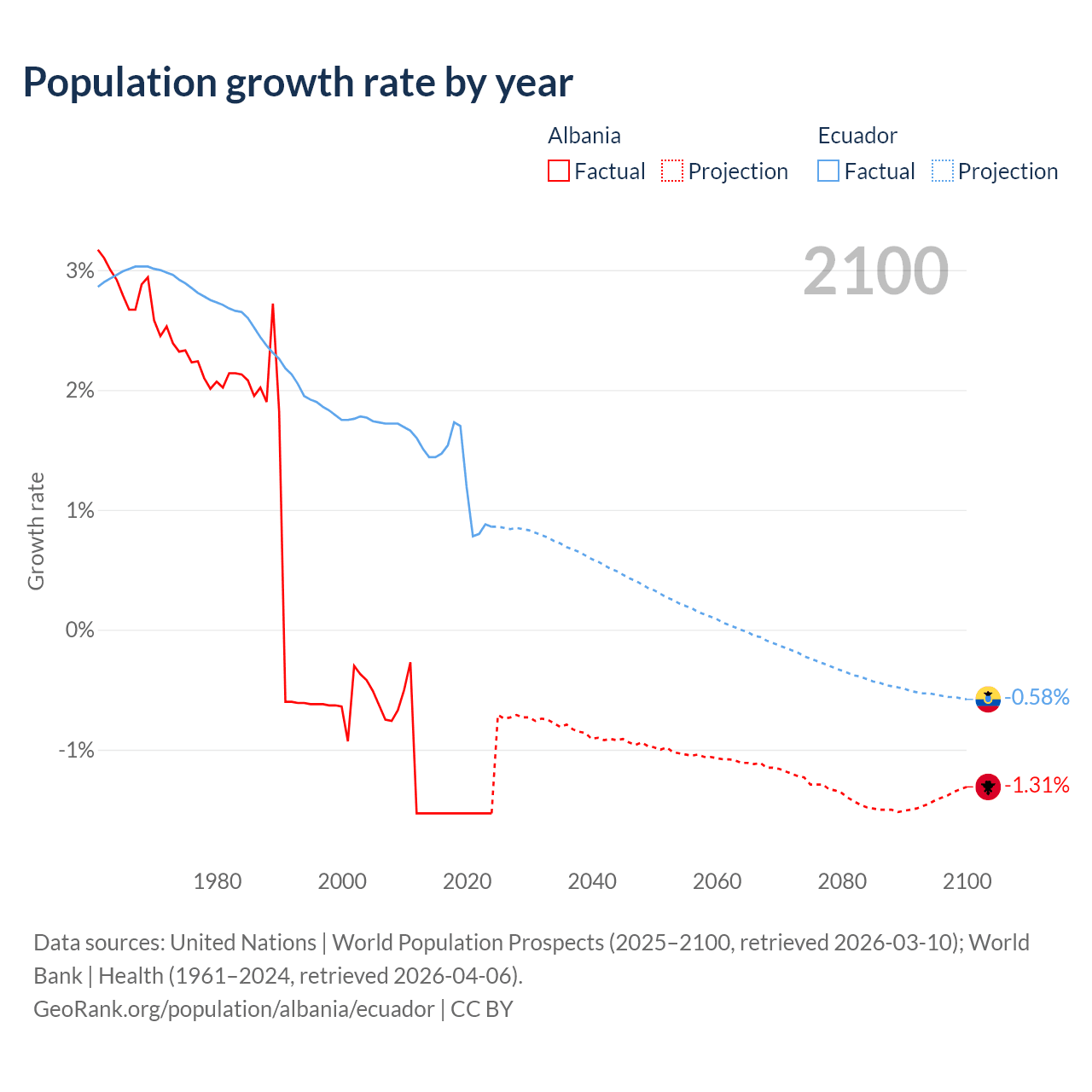 - For the last 10 years, Albania has had an average growth rate of -1.53% per year vs +1.26% in Ecuador.