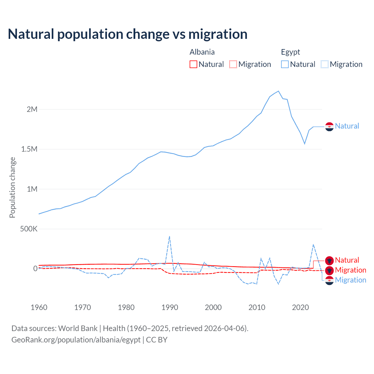 Over the last 10 years, 30% of the population change in Albania is from natural causes (a gain of 83,840 people) and 70% is from migration (a loss of 195,891 people). In Egypt 99.6% is from natural causes (a gain of 19,180,073 people) and 0.41% is from migration (a loss of 78,975 people).
