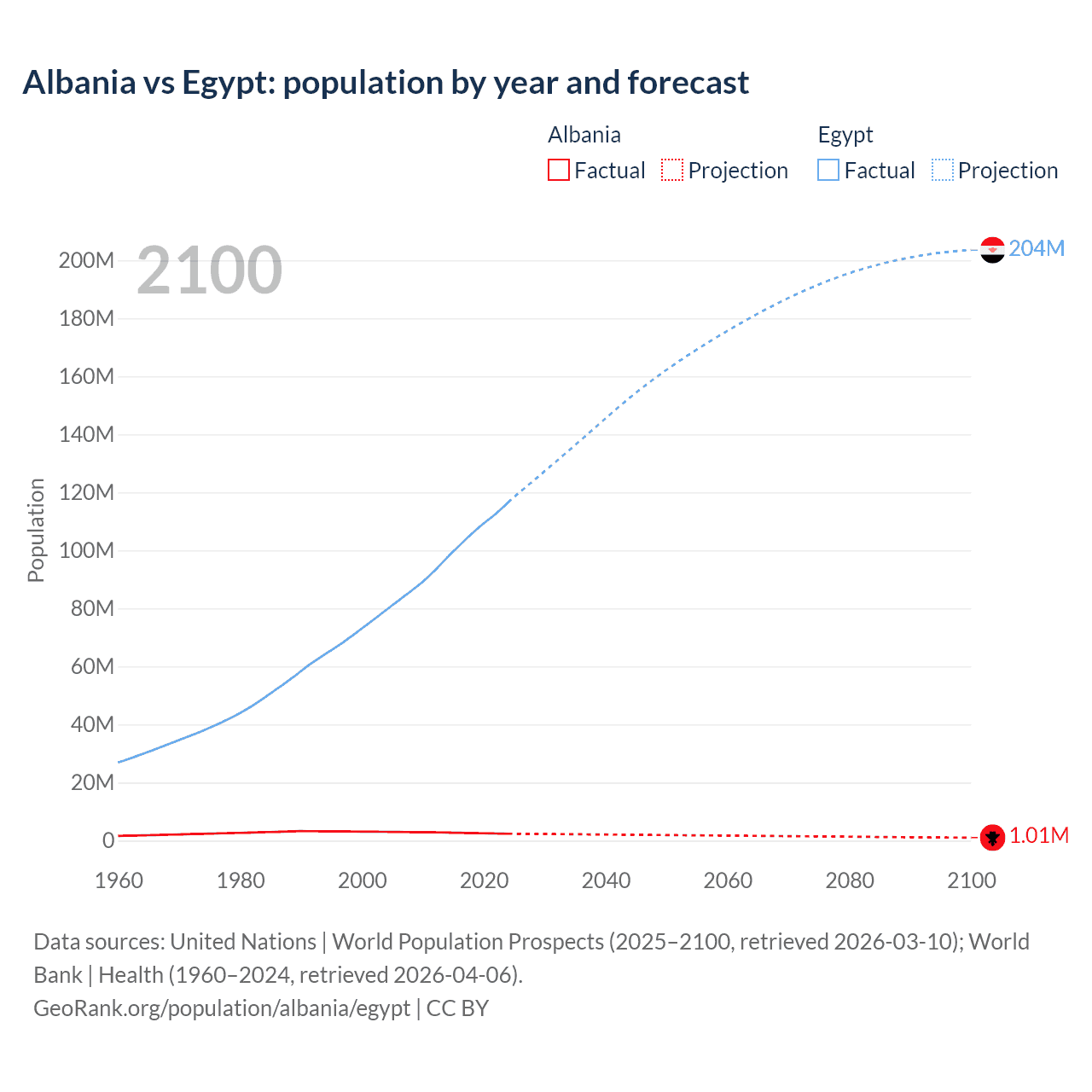 - Since 2006, the population of Albania has decreased from 2.99M people to 2.34M (21.7% decline), while Egypt has grown from 82.7M to 121M (45.9% growth).