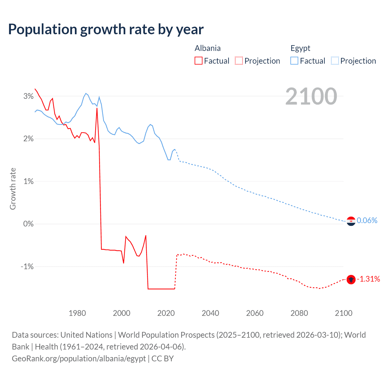 - For the last 10 years, Albania has had an average growth rate of -1.53% per year vs +1.84% in Egypt.