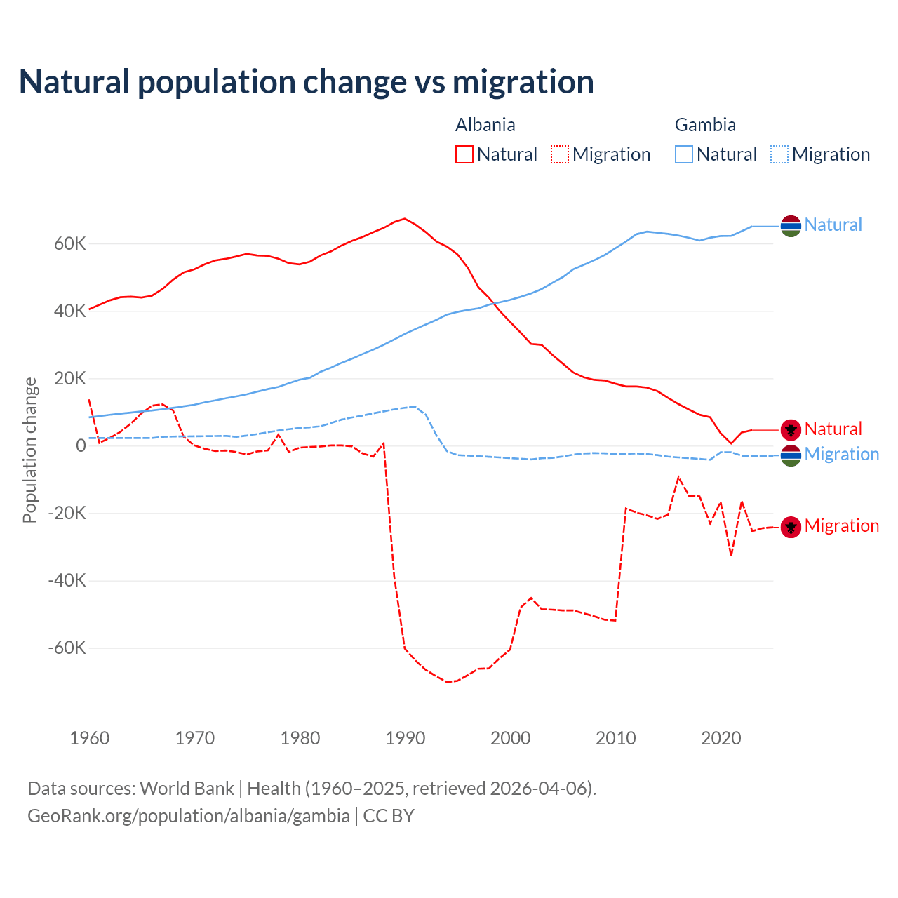 Over the last 10 years, 30% of the population change in Albania is from natural causes (a gain of 83,840 people) and 70% is from migration (a loss of 195,891 people). In the Gambia 95.2% is from natural causes (a gain of 625,795 people) and 4.75% is from migration (a loss of 31,227 people).