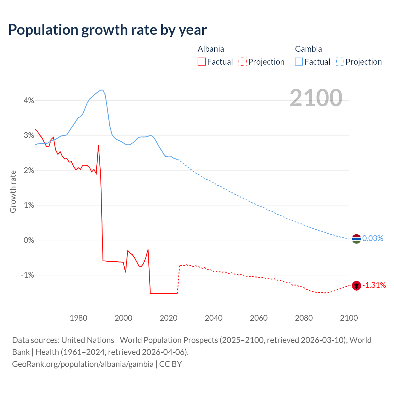 - For the last 10 years, Albania has had an average growth rate of -1.53% per year vs +2.5% in the Gambia.