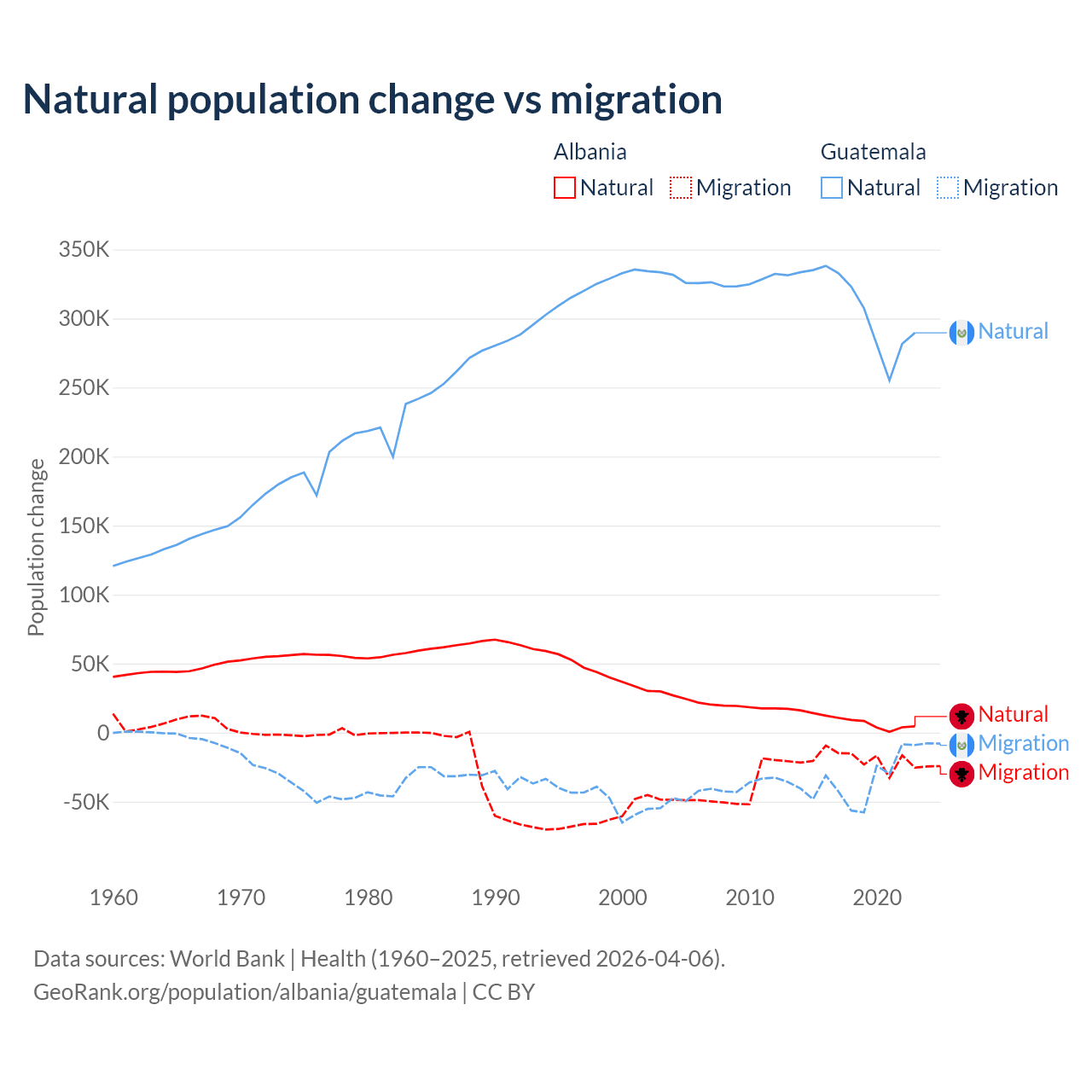 Over the last 10 years, 30% of the population change in Albania is from natural causes (a gain of 83,840 people) and 70% is from migration (a loss of 195,891 people). In Guatemala 89.8% is from natural causes (a gain of 3,077,847 people) and 10.2% is from migration (a loss of 347,818 people).