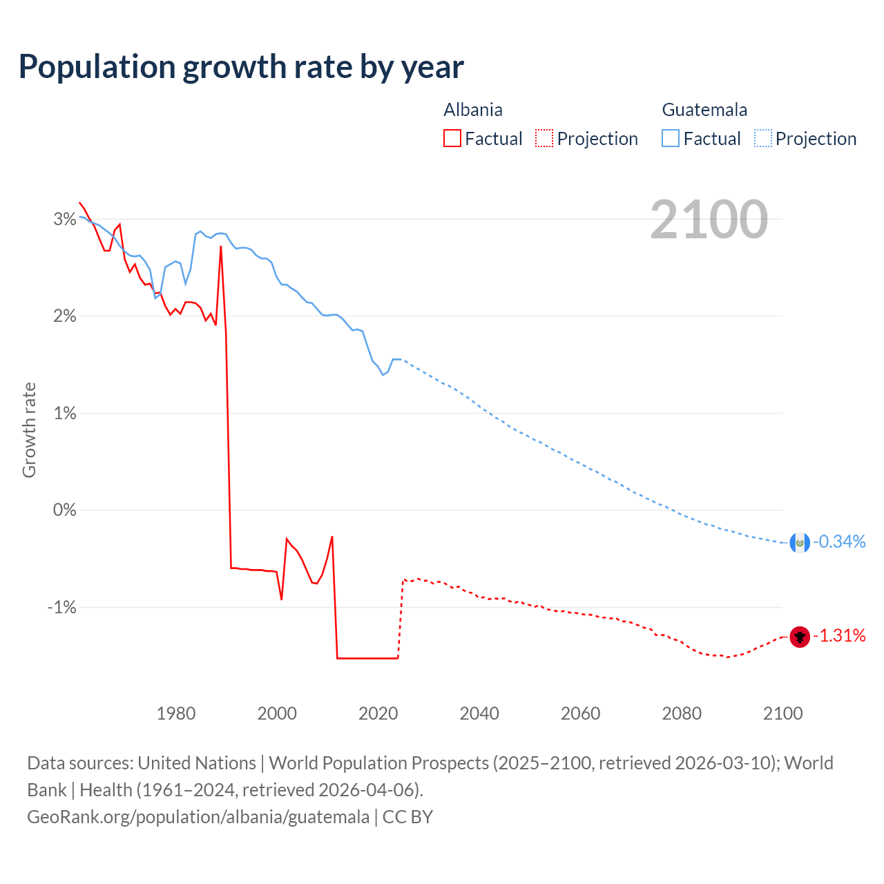 - For the last 10 years, Albania has had an average growth rate of -1.53% per year vs +1.64% in Guatemala.