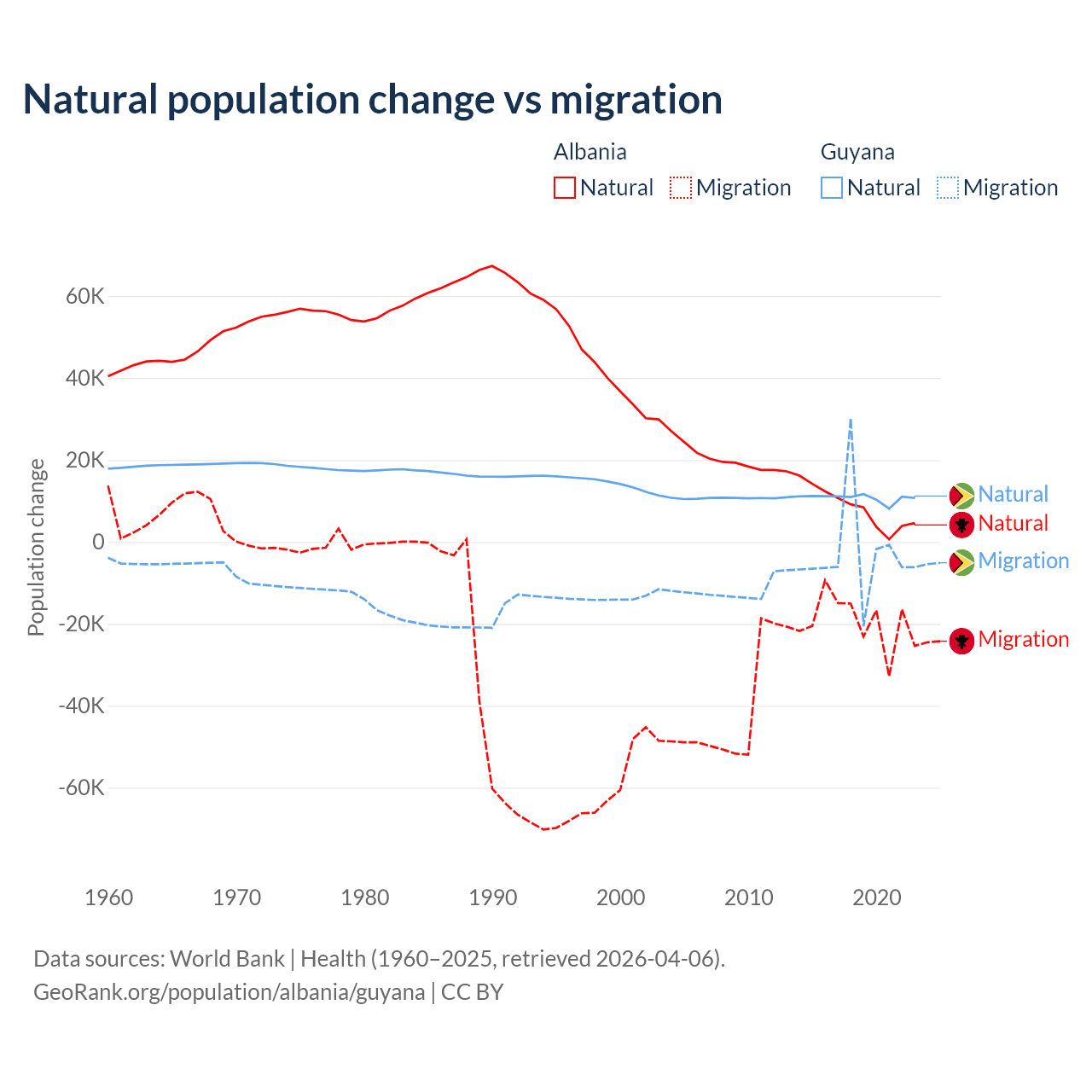 Over the last 10 years, 30% of the population change in Albania is from natural causes (a gain of 83,840 people) and 70% is from migration (a loss of 195,891 people). In Guyana 77.7% is from natural causes (a gain of 107,419 people) and 22.3% is from migration (a loss of 30,797 people).