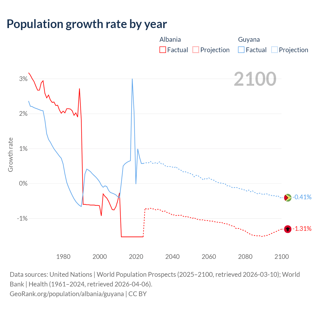 - For the last 10 years, Albania has had an average growth rate of -1.53% per year vs +0.94% in Guyana.