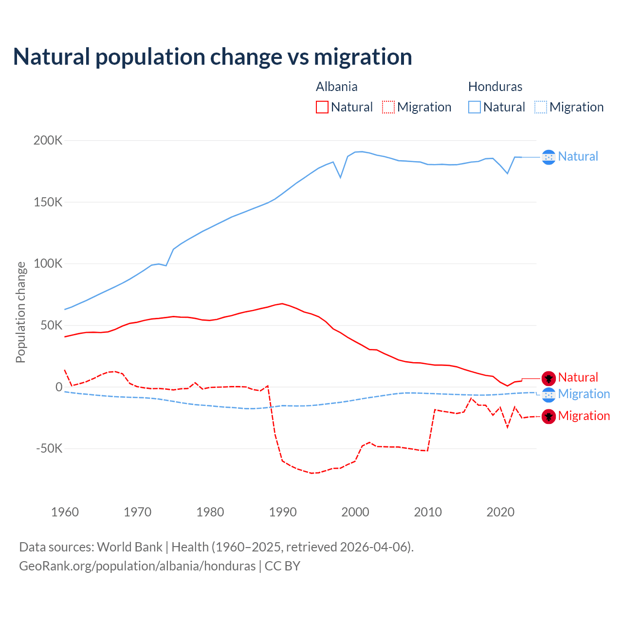 Over the last 10 years, 30% of the population change in Albania is from natural causes (a gain of 83,840 people) and 70% is from migration (a loss of 195,891 people). In Honduras 96.7% is from natural causes (a gain of 1,821,125 people) and 3.29% is from migration (a loss of 61,965 people).
