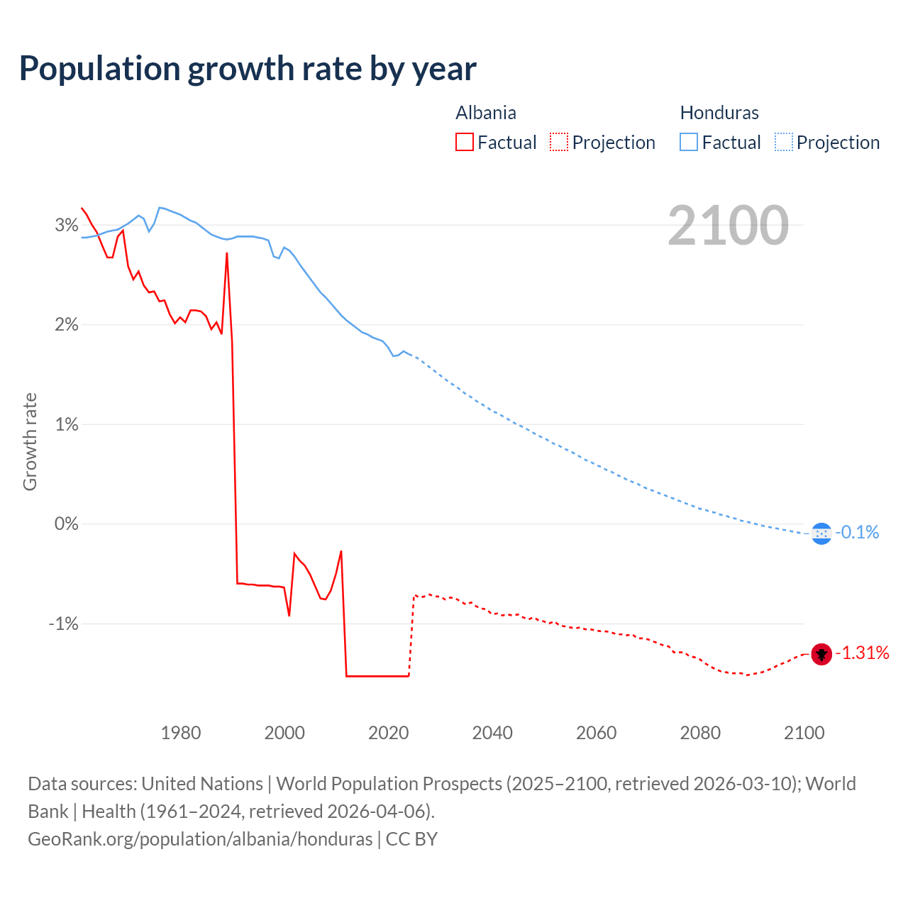 - For the last 10 years, Albania has had an average growth rate of -1.53% per year vs +1.81% in Honduras.