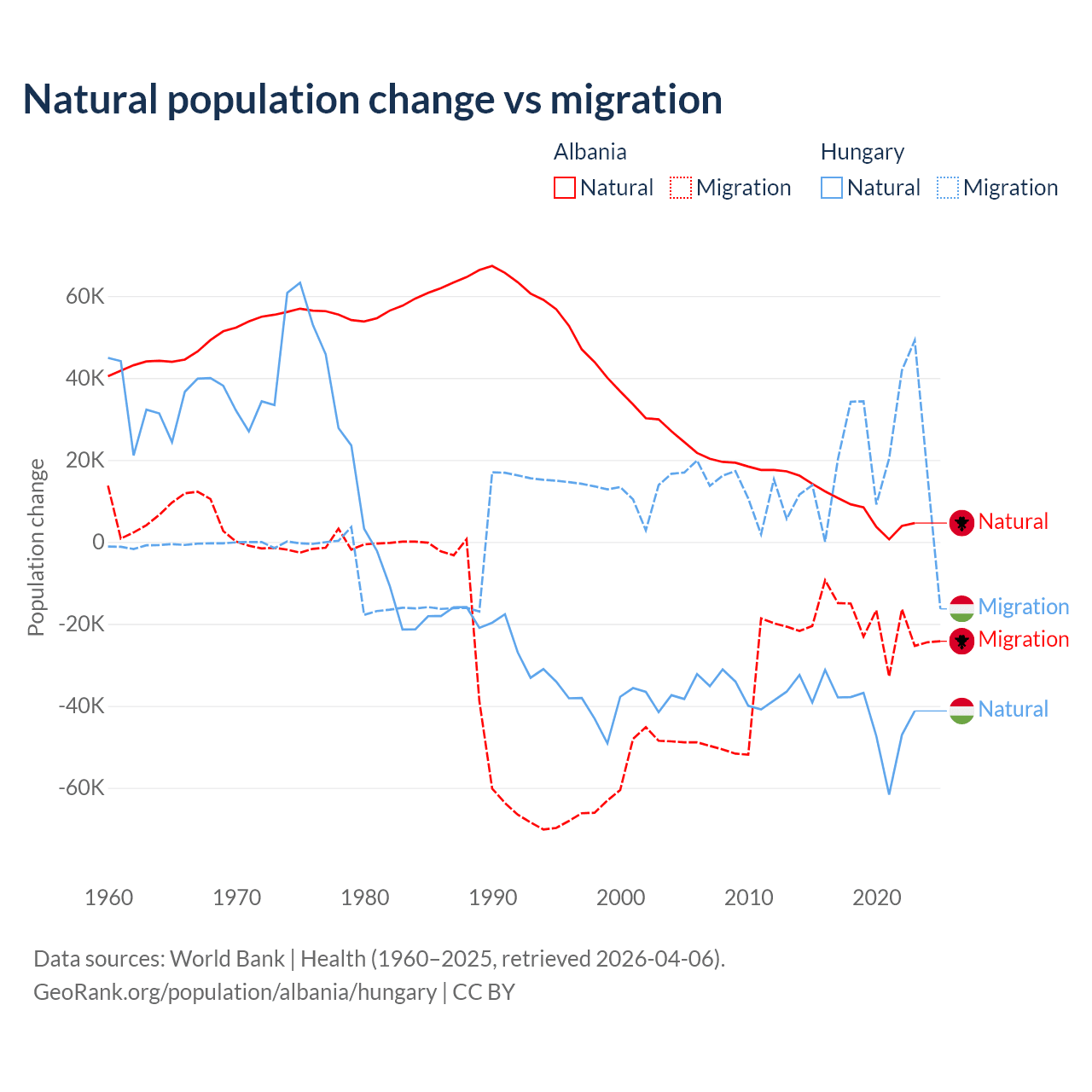 Over the last 10 years, 30% of the population change in Albania is from natural causes (a gain of 83,840 people) and 70% is from migration (a loss of 195,891 people). In Hungary 63.7% is from natural causes (a loss of 412,838 people) and 36.3% is from migration (a gain of 234,837 people).