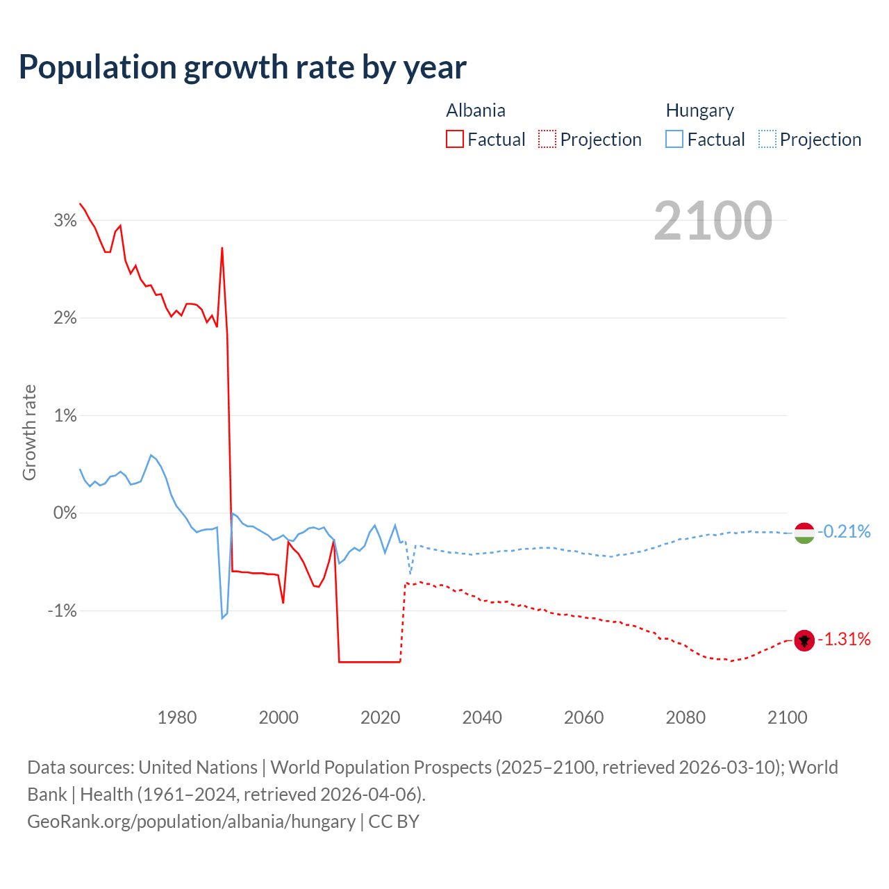- For the last 10 years, Albania has had an average growth rate of -1.53% per year vs -0.29% in Hungary.