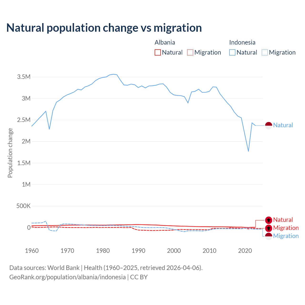 Over the last 10 years, 30% of the population change in Albania is from natural causes (a gain of 83,840 people) and 70% is from migration (a loss of 195,891 people). In Indonesia 98.9% is from natural causes (a gain of 25,242,860 people) and 1.1% is from migration (a loss of 280,258 people).