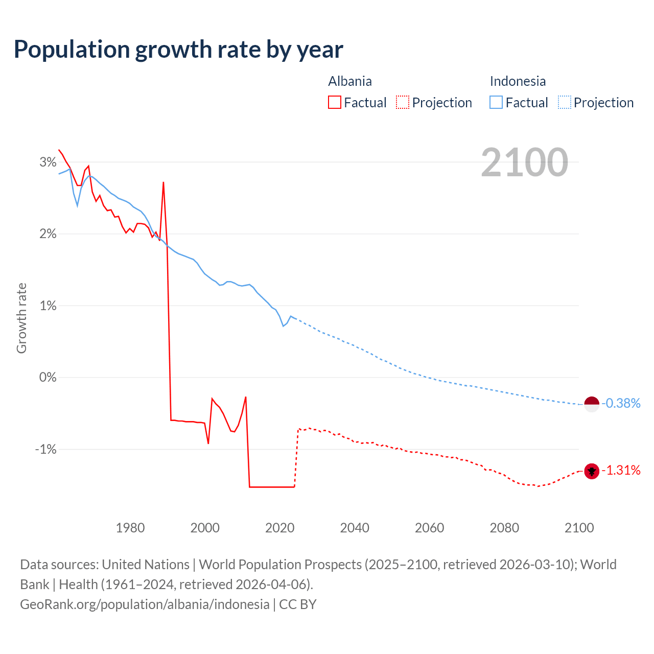 - For the last 10 years, Albania has had an average growth rate of -1.53% per year vs +0.94% in Indonesia.
