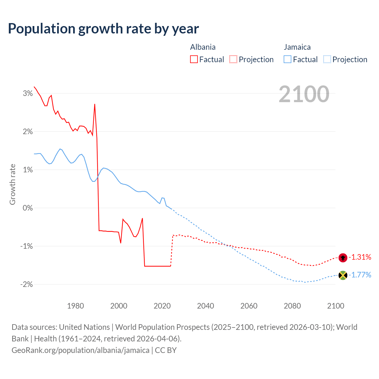 - For the last 10 years, Albania has had an average growth rate of -1.53% per year vs +0.18% in Jamaica.