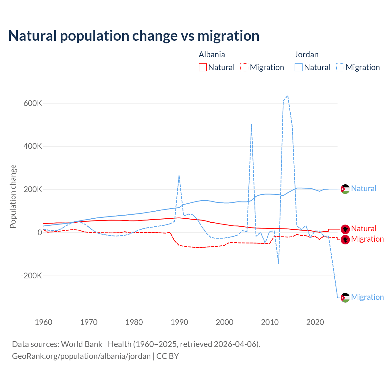 Over the last 10 years, 30% of the population change in Albania is from natural causes (a gain of 83,840 people) and 70% is from migration (a loss of 195,891 people). In Jordan 63.2% is from natural causes (a gain of 1,991,452 people) and 36.8% is from migration (a gain of 1,157,625 people).