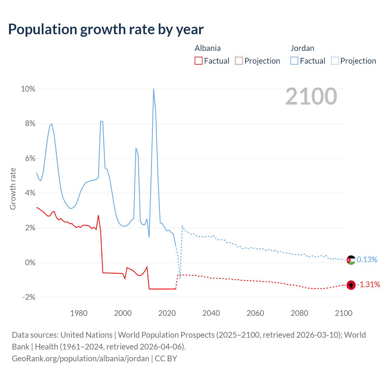 - For the last 10 years, Albania has had an average growth rate of -1.53% per year vs +3.45% in Jordan.