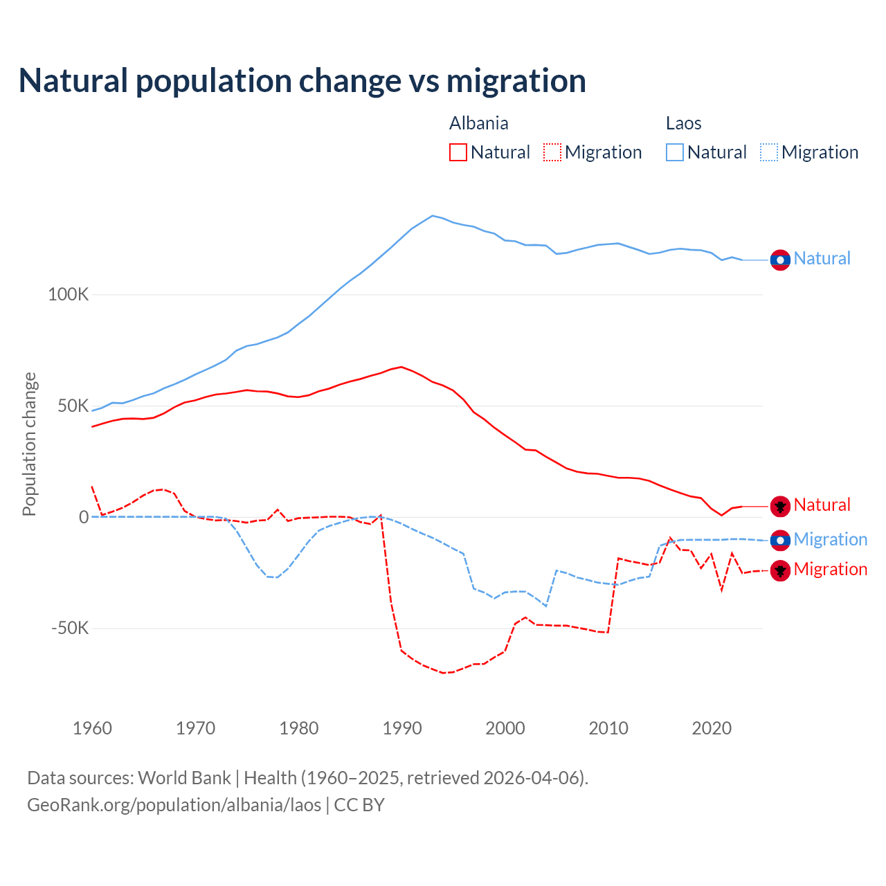 Over the last 10 years, 30% of the population change in Albania is from natural causes (a gain of 83,840 people) and 70% is from migration (a loss of 195,891 people). In Laos 90.6% is from natural causes (a gain of 1,183,013 people) and 9.41% is from migration (a loss of 122,899 people).