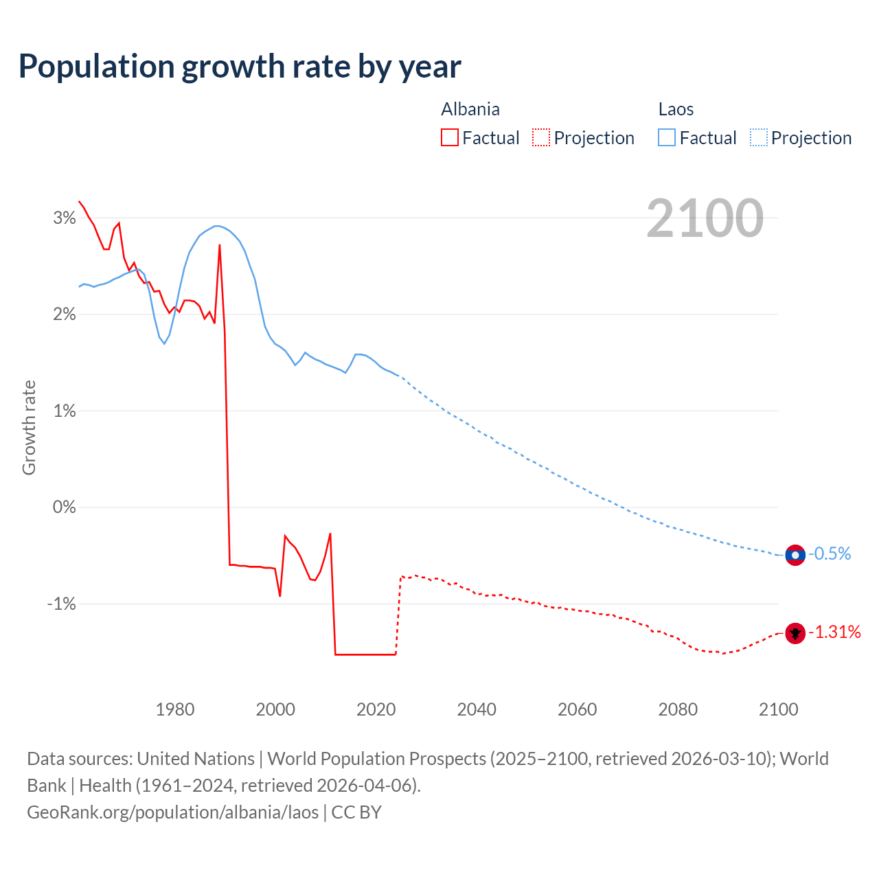 - For the last 10 years, Albania has had an average growth rate of -1.53% per year vs +1.48% in Laos.