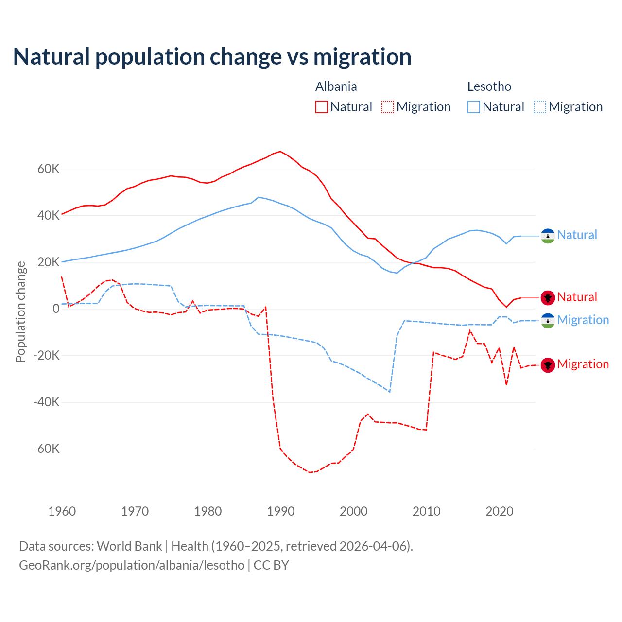 Over the last 10 years, 30% of the population change in Albania is from natural causes (a gain of 83,840 people) and 70% is from migration (a loss of 195,891 people). In Lesotho 84.2% is from natural causes (a gain of 315,836 people) and 15.8% is from migration (a loss of 59,457 people).