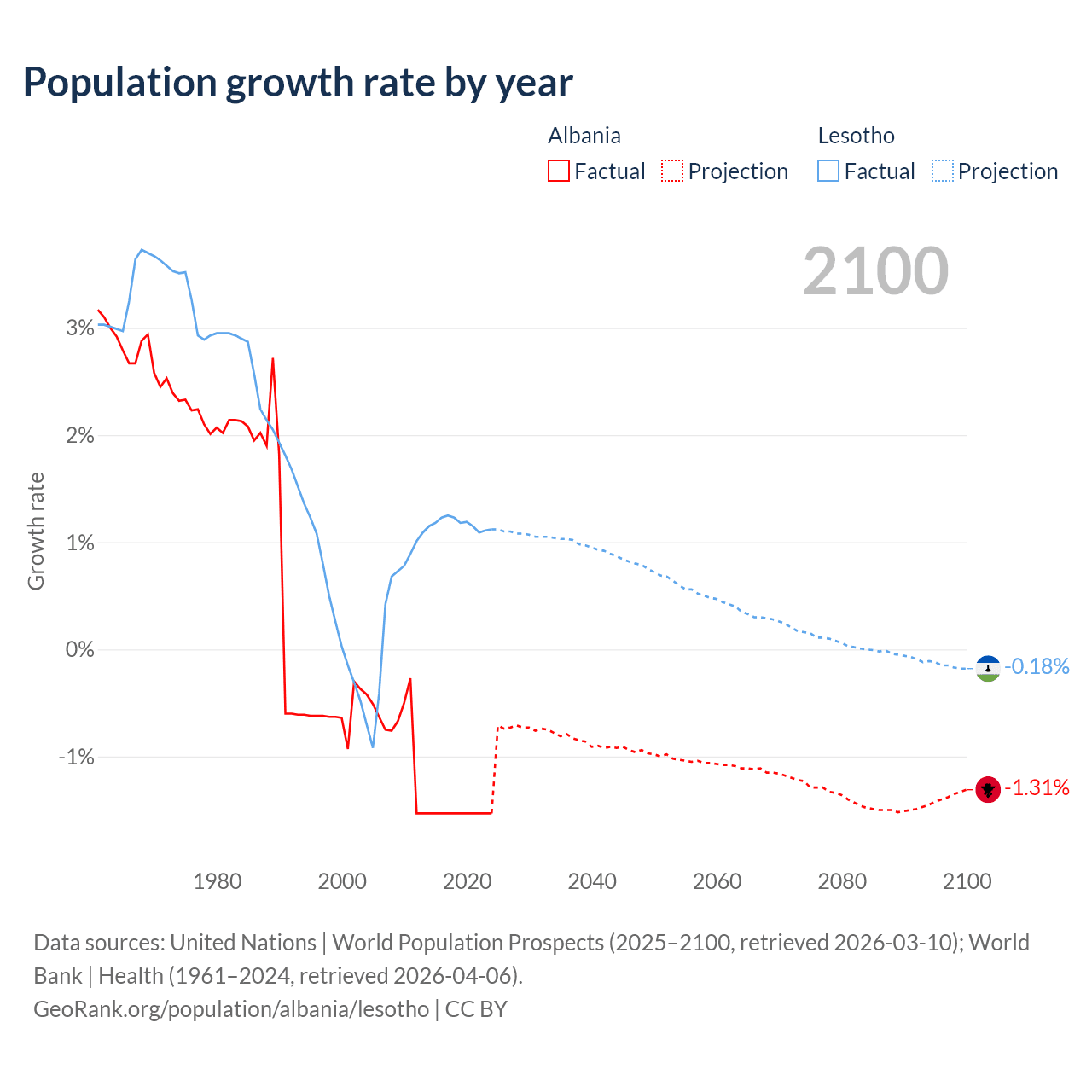 - For the last 10 years, Albania has had an average growth rate of -1.53% per year vs +1.17% in Lesotho.