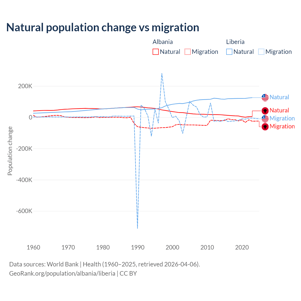 Over the last 10 years, 30% of the population change in Albania is from natural causes (a gain of 83,840 people) and 70% is from migration (a loss of 195,891 people). In Liberia 87.7% is from natural causes (a gain of 1,202,387 people) and 12.3% is from migration (a loss of 168,316 people).