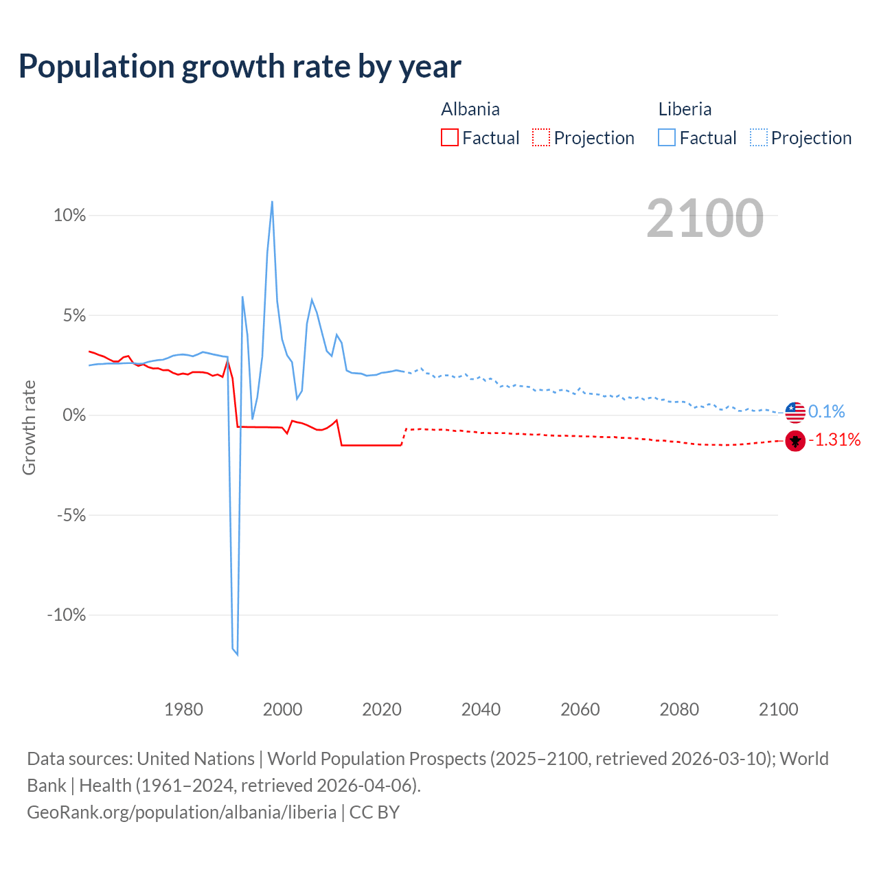 - For the last 10 years, Albania has had an average growth rate of -1.53% per year vs +2.09% in Liberia.