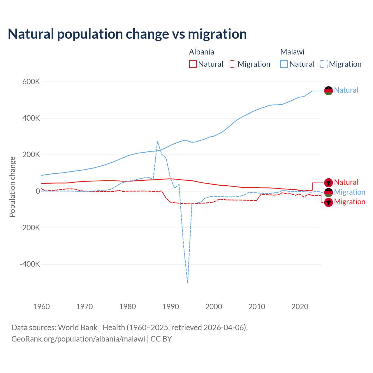 Over the last 10 years, 30% of the population change in Albania is from natural causes (a gain of 83,840 people) and 70% is from migration (a loss of 195,891 people). In Malawi 99.3% is from natural causes (a gain of 5,019,393 people) and 0.67% is from migration (a loss of 33,768 people).