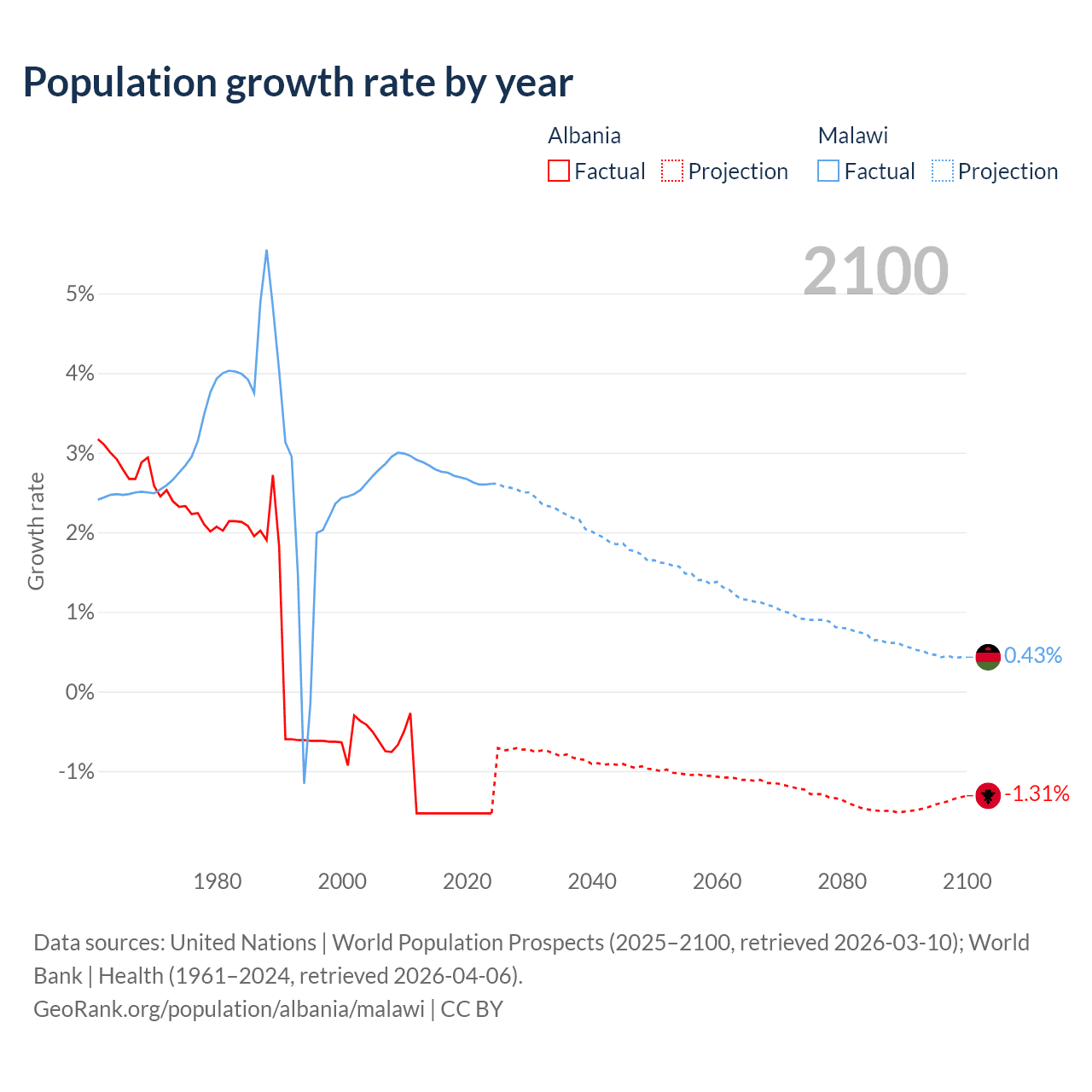 - For the last 10 years, Albania has had an average growth rate of -1.53% per year vs +2.7% in Malawi.