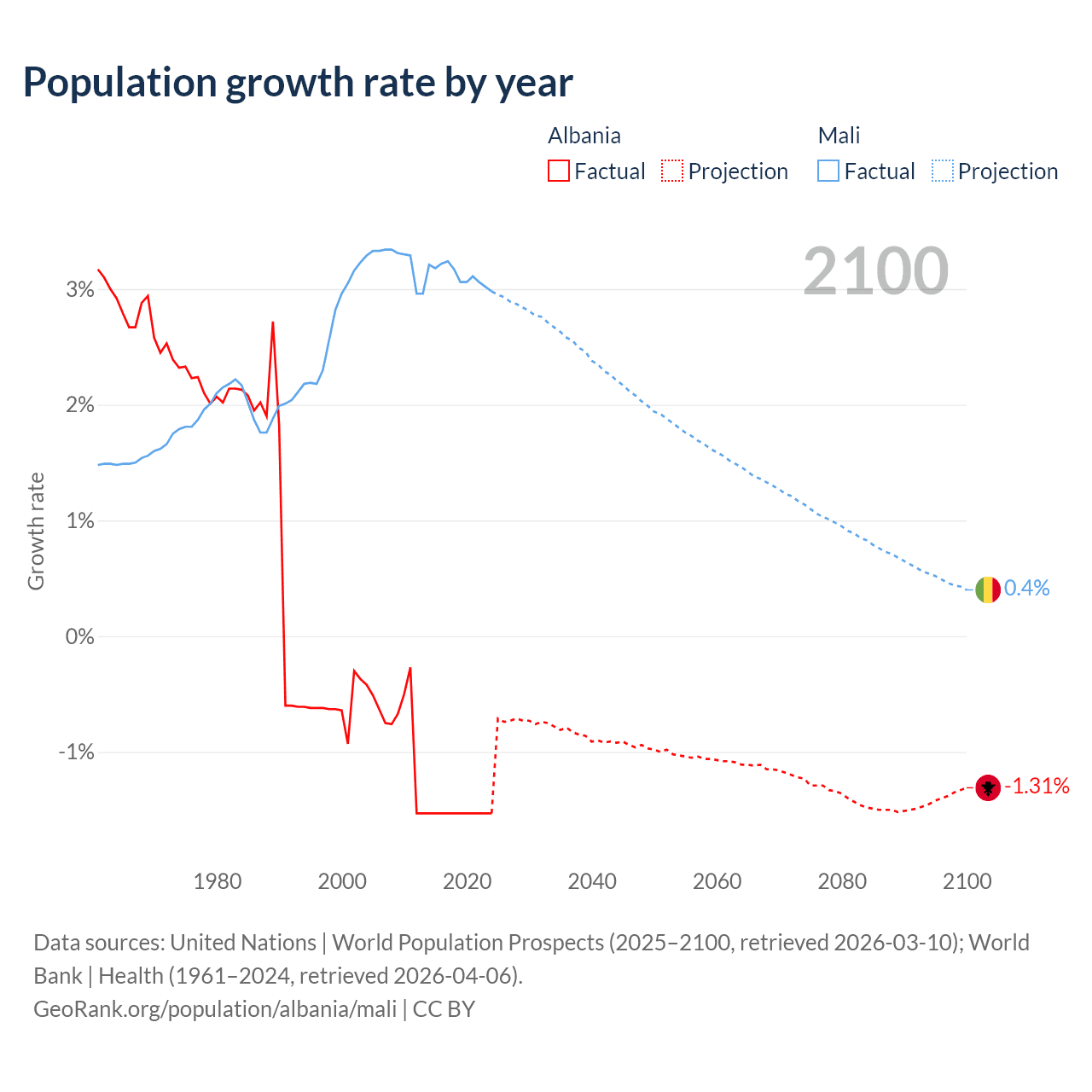 - For the last 10 years, Albania has had an average growth rate of -1.53% per year vs +3.12% in Mali.