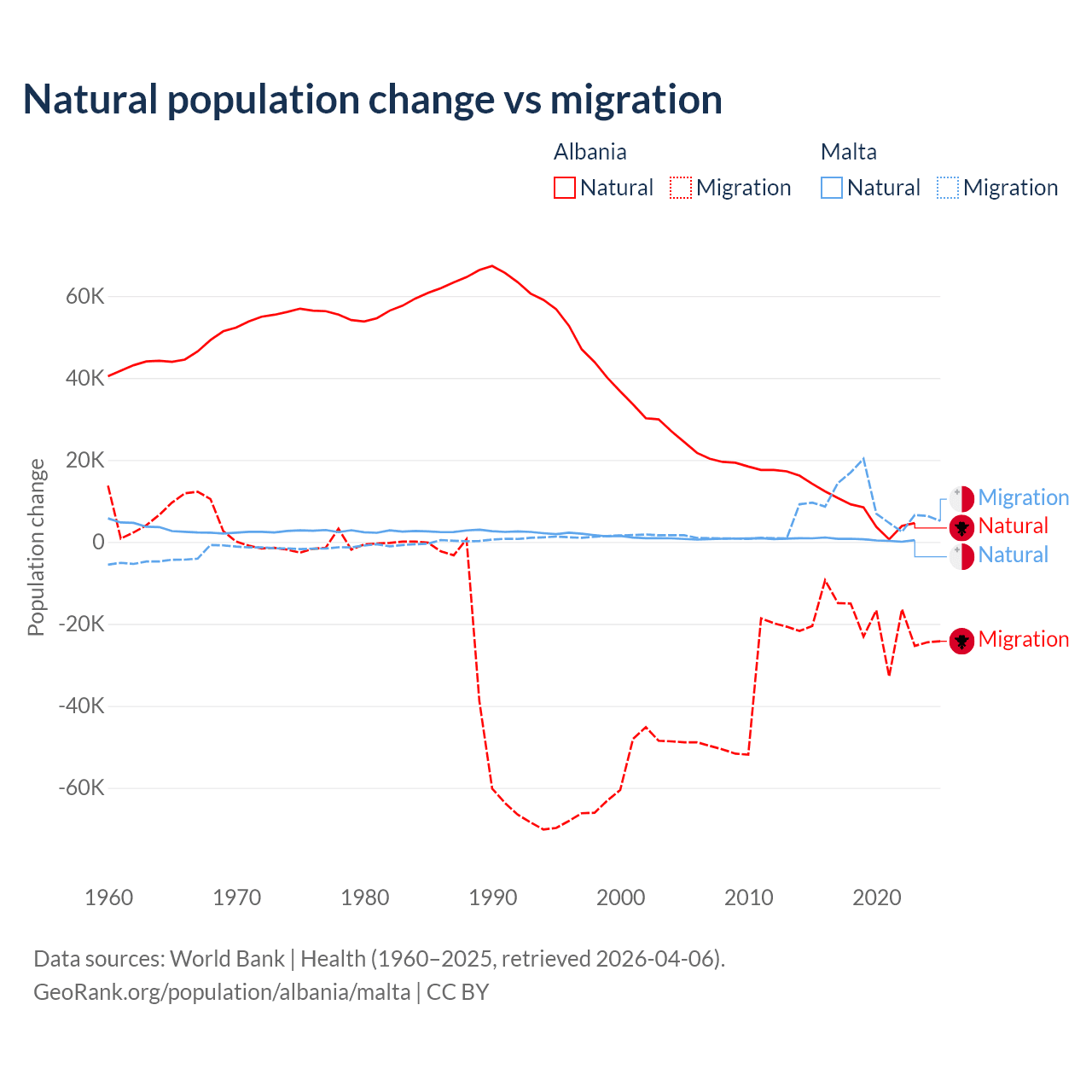 Over the last 10 years, 30% of the population change in Albania is from natural causes (a gain of 83,840 people) and 70% is from migration (a loss of 195,891 people). In Malta 5.84% is from natural causes (a gain of 6,181 people) and 94.2% is from migration (a gain of 99,652 people).