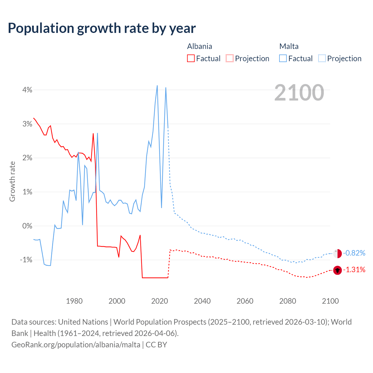 - For the last 10 years, Albania has had an average growth rate of -1.53% per year vs +2.69% in Malta.