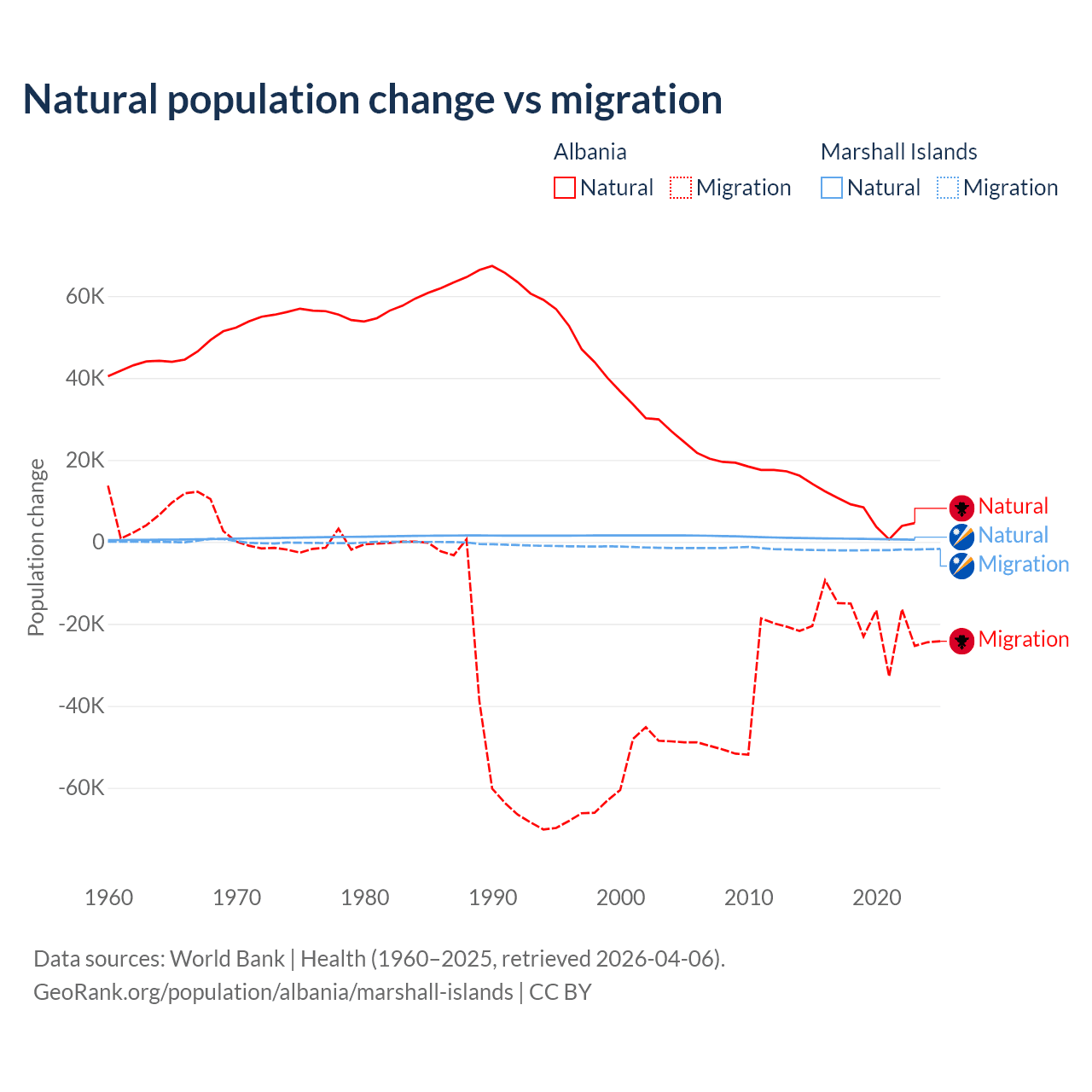 Over the last 10 years, 30% of the population change in Albania is from natural causes (a gain of 83,840 people) and 70% is from migration (a loss of 195,891 people). In the Marshall Islands 27.8% is from natural causes (a gain of 7,592 people) and 72.2% is from migration (a loss of 19,682 people).