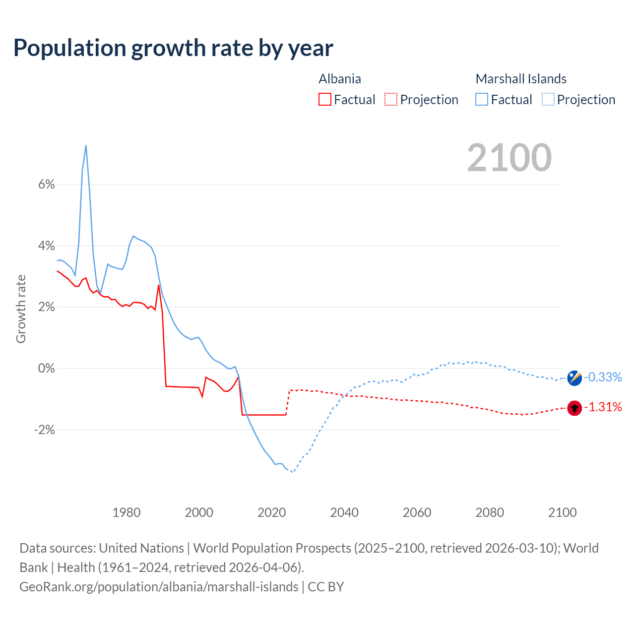 - For the last 10 years, Albania has had an average growth rate of -1.53% per year vs -2.69% in the Marshall Islands.