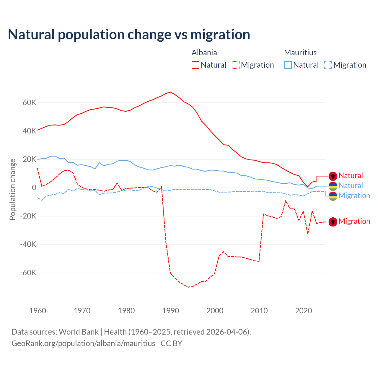 Over the last 10 years, 30% of the population change in Albania is from natural causes (a gain of 83,840 people) and 70% is from migration (a loss of 195,891 people). In Mauritius 30.9% is from natural causes (a gain of 19,327 people) and 69.1% is from migration (a loss of 43,294 people).