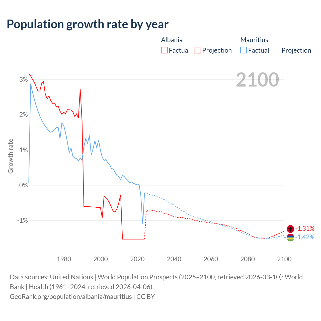 - For the last 10 years, Albania has had an average growth rate of -1.53% per year vs -0.09% in Mauritius.