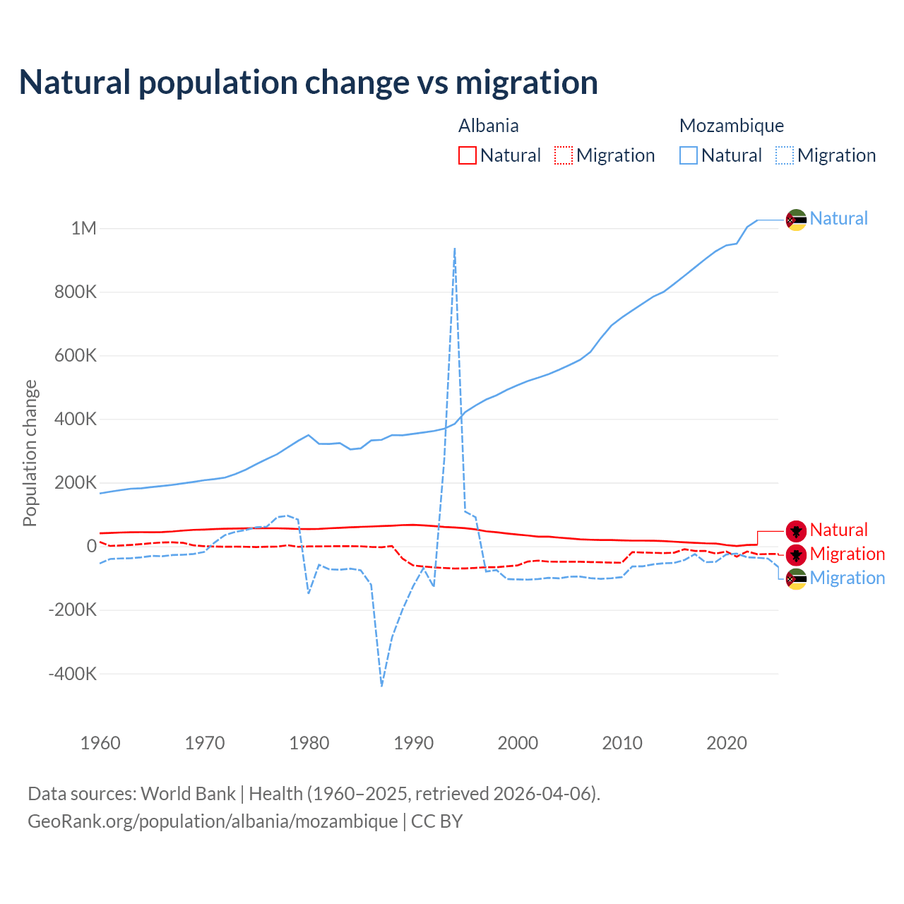 Over the last 10 years, 30% of the population change in Albania is from natural causes (a gain of 83,840 people) and 70% is from migration (a loss of 195,891 people). In Mozambique 95.9% is from natural causes (a gain of 9,108,203 people) and 4.15% is from migration (a loss of 393,923 people).