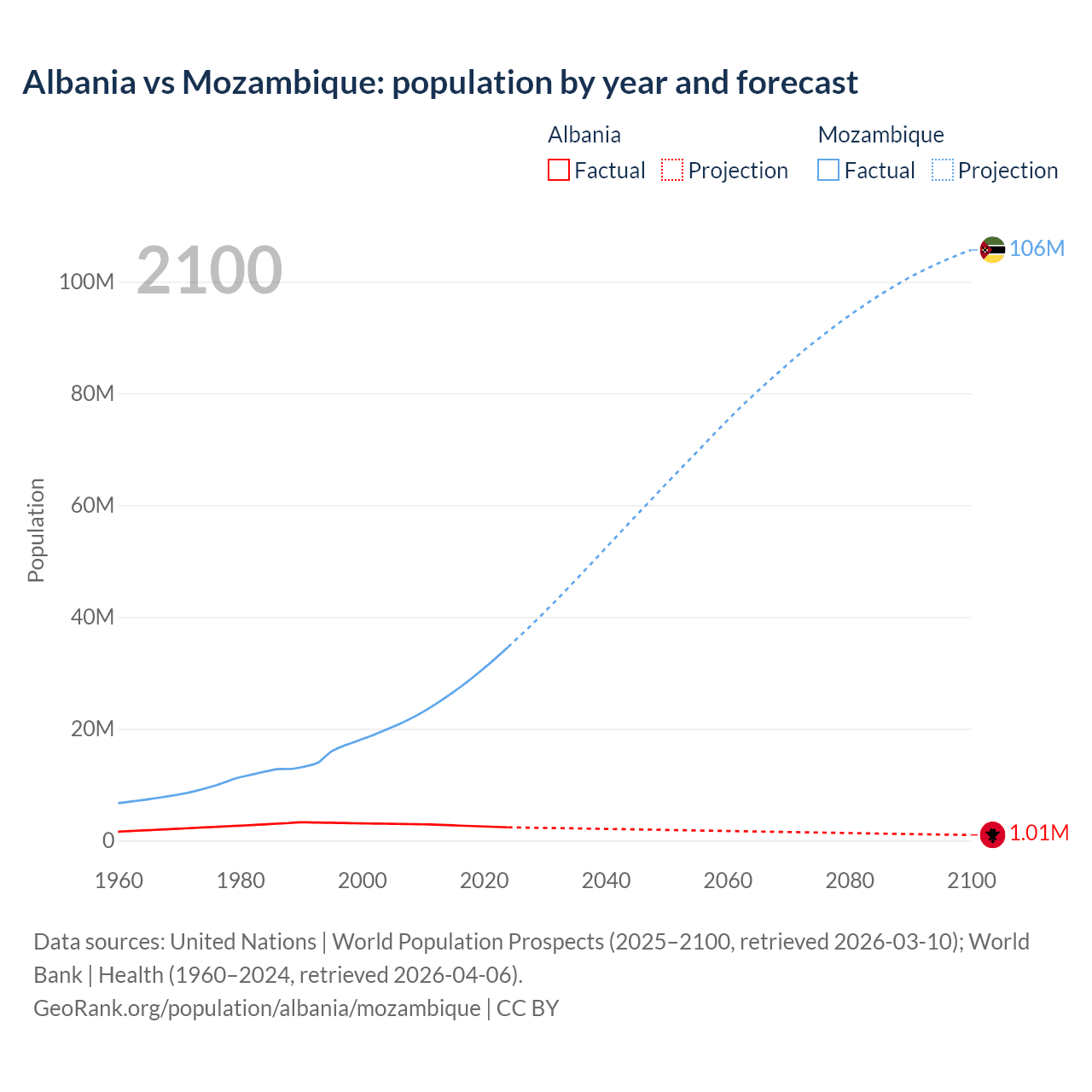 Albania vs Mozambique: population by year and forecast