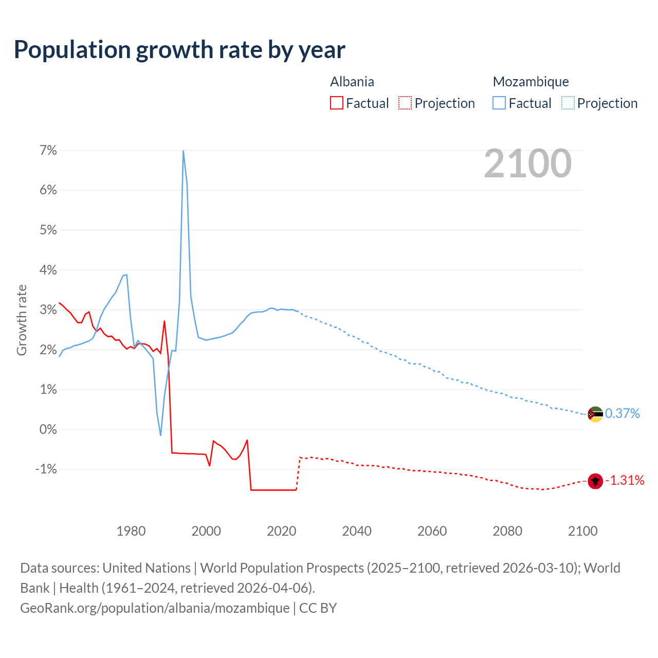 - For the last 10 years, Albania has had an average growth rate of -1.53% per year vs +2.99% in Mozambique.