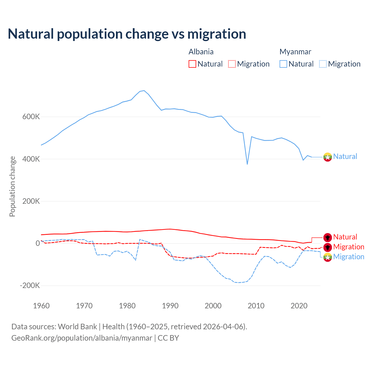 Over the last 10 years, 30% of the population change in Albania is from natural causes (a gain of 83,840 people) and 70% is from migration (a loss of 195,891 people). In Myanmar 86% is from natural causes (a gain of 4,594,615 people) and 14% is from migration (a loss of 749,272 people).