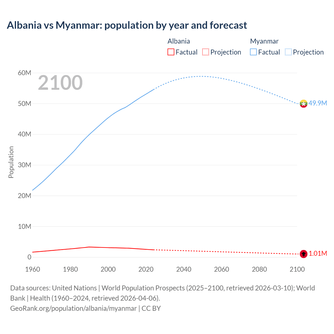 - Since 2006, the population of Albania has decreased from 2.99M people to 2.34M (21.7% decline), while Myanmar has grown from 47.8M to 55.3M (15.7% growth).