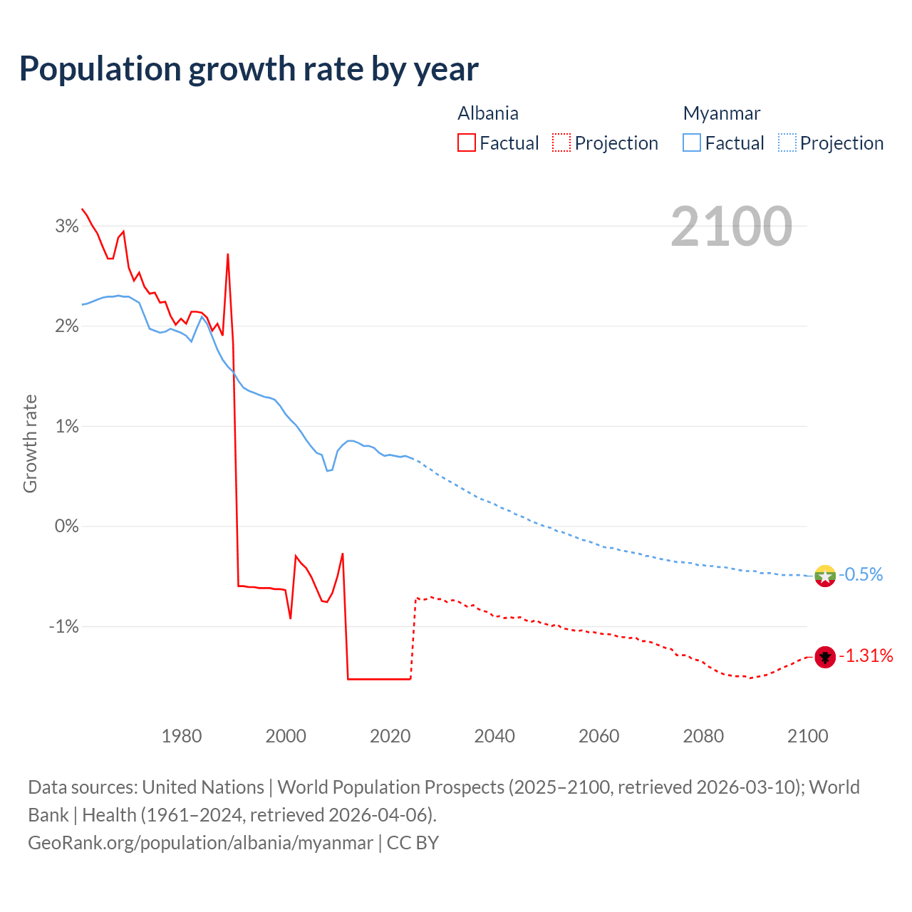 - For the last 10 years, Albania has had an average growth rate of -1.53% per year vs +0.74% in Myanmar.
