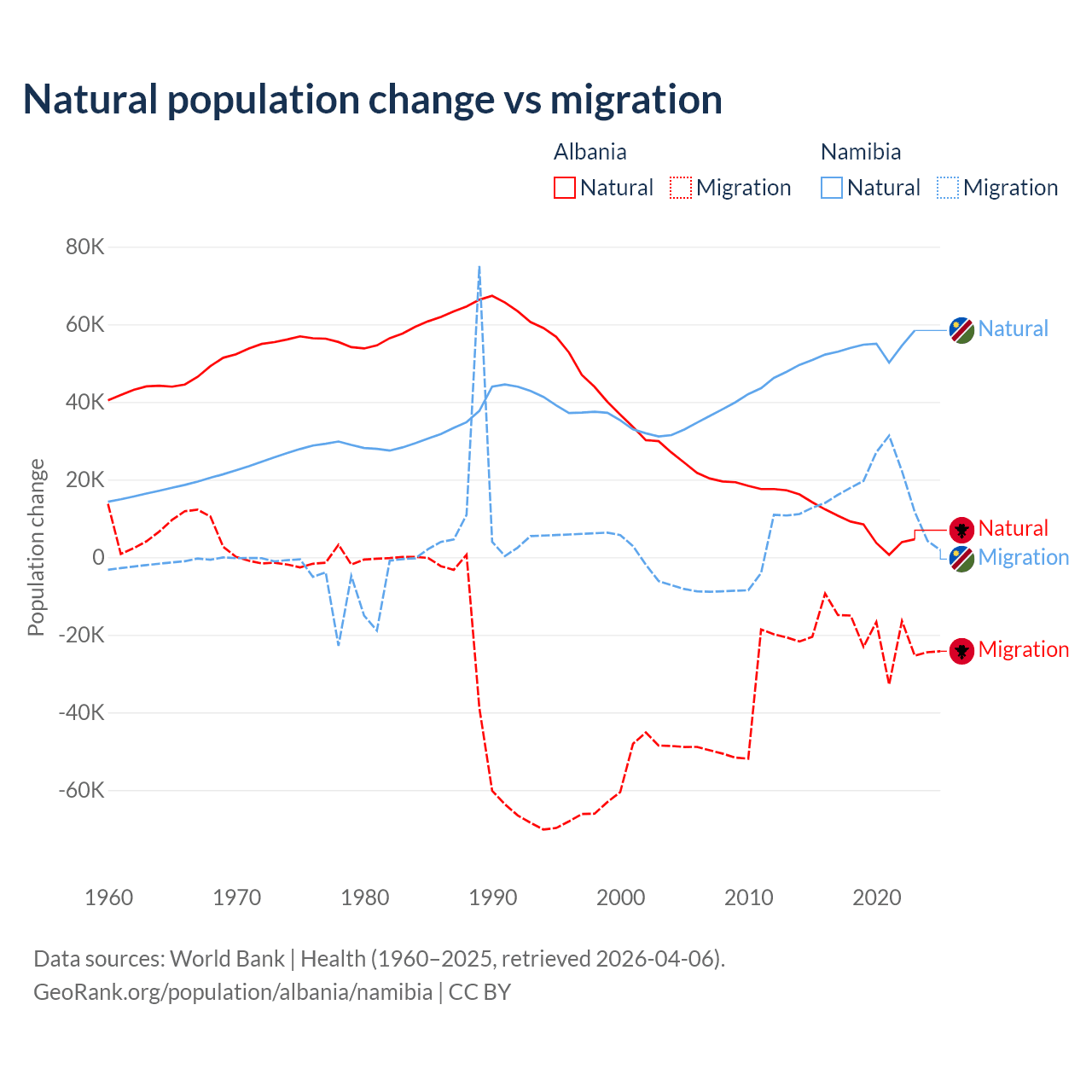 Over the last 10 years, 30% of the population change in Albania is from natural causes (a gain of 83,840 people) and 70% is from migration (a loss of 195,891 people). In Namibia 74.3% is from natural causes (a gain of 532,532 people) and 25.7% is from migration (a gain of 183,837 people).